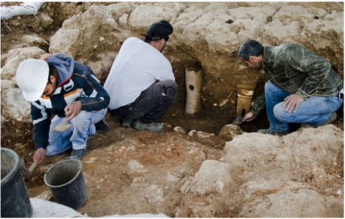 圖為考古學(xué)家在現(xiàn)場清理發(fā)掘葡萄酒釀酒設(shè)備